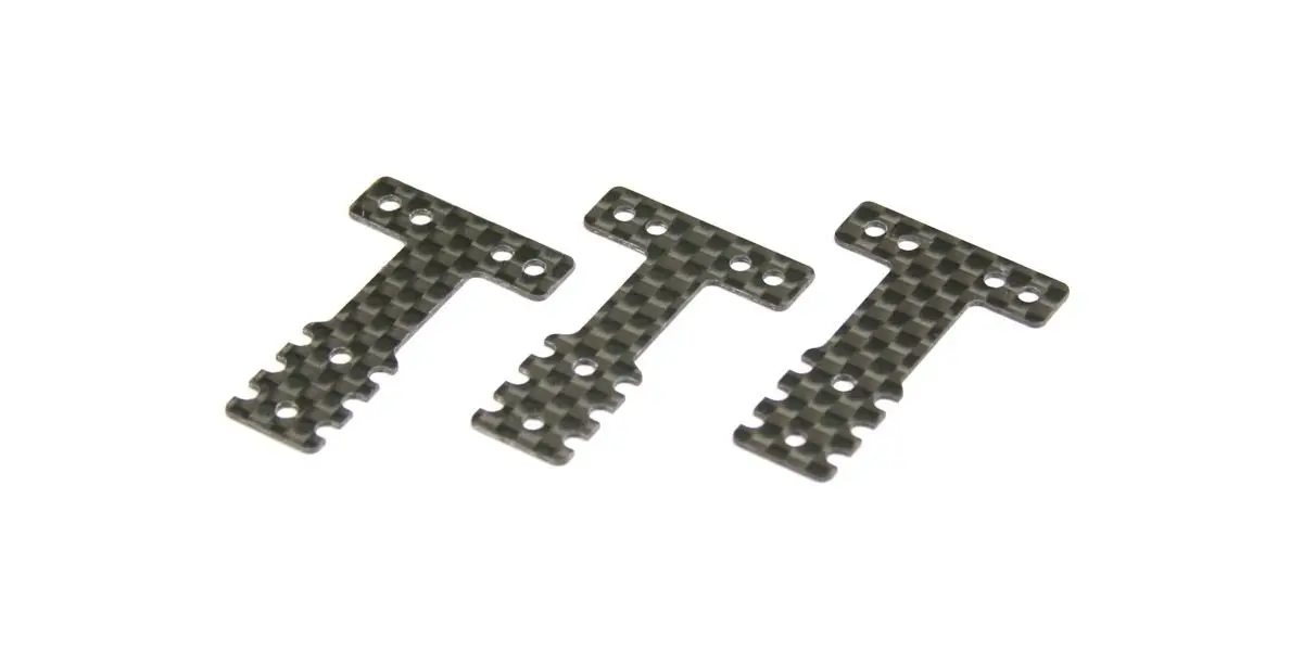 Enhance your Mini-Z RC car's performance with this carbon fibre rear suspension plate set, engineered for the Kyosho MR03 RM and HM-Type chassis. These optional Kyosho spare parts significantly increase rear rigidity, making them ideal for high-traction surfaces and competitive racing. The set includes three plates with varying widths and stiffness levels, allowing you to fine-tune chassis flex to match different track conditions perfectly.