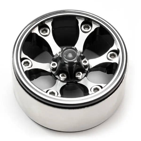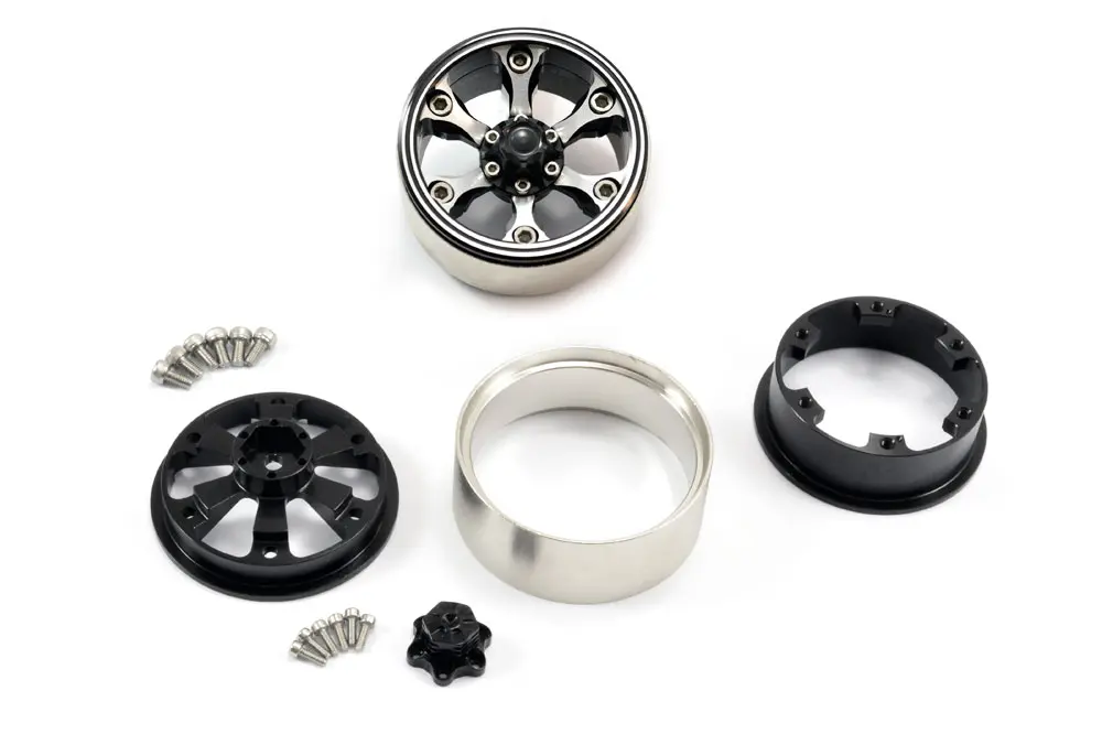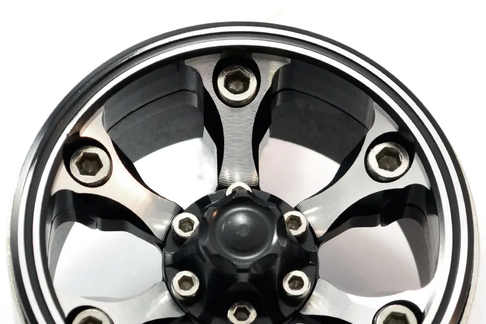 Suitable for most popular 1/10th scale crawlers with a 12mm Hex fitment, these all aluminium 1.9” sized, 3-piece beadloc wheels are the ultimate finish to any scale rig. Featuring a black anodised and machined face, these 6-spoke wheels mirror the aggressive styling of full size all terrain designs. Once mounted on your rig a bolted centre cap hides your wheel nut and axle assembly for a truly stunning finish. Furthermore the heavy centre ring adds much needed weight on all four corners to keep your chassis on the ground and ready to drive up and over any terrain.