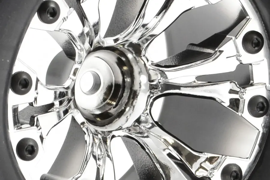 Suitable for most 1:10 Monster trucks with 12mm Hex fit and 5mm axle. Sold as pair. (Chrome only)