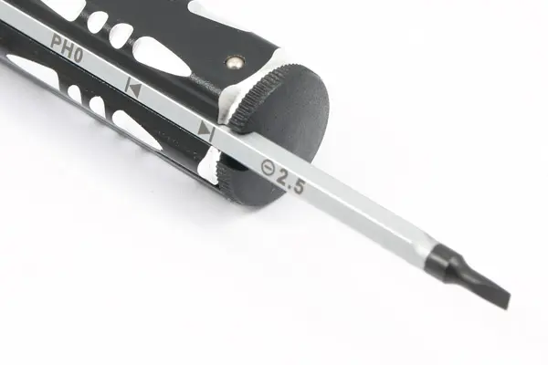 Phillips PH00 and PH0, 1.5mm and 2.5mm flat head screw driver bits.