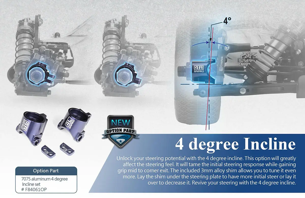 Enhance your Sparko F8 radio controlled car with these precision-engineered aluminium steering blocks. Designed specifically for the F8 platform, this pair of components offers a 4-degree angle geometry that optimises steering response and handling characteristics for competitive off-road performance. Crafted from lightweight yet durable aluminium alloy, these blocks provide excellent rigidity whilst keeping overall weight minimal—a crucial factor in maintaining your RC car's speed and agility on the track.