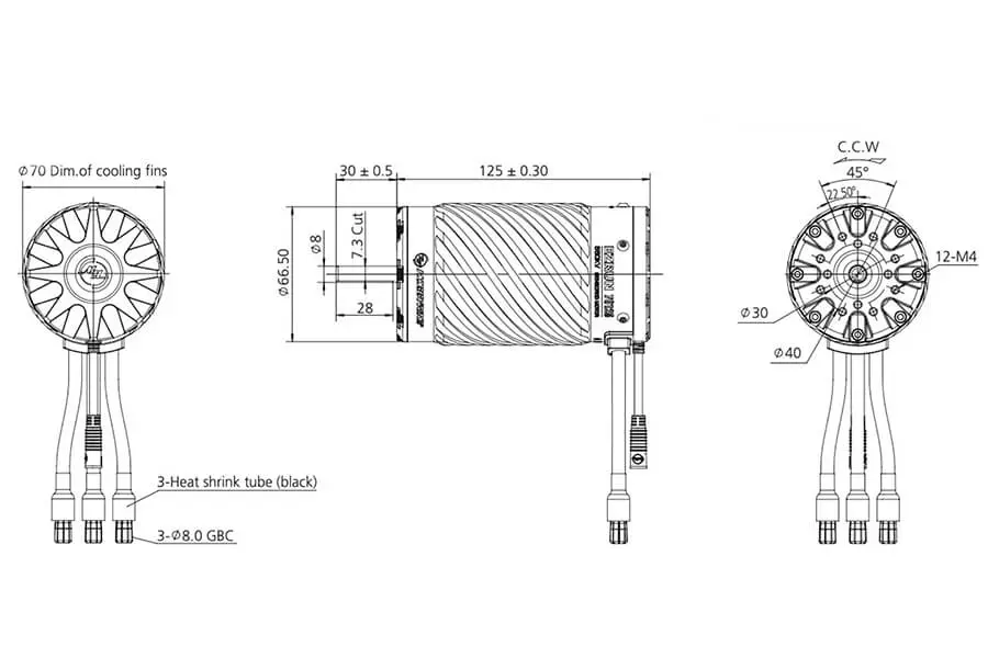 - 70mm diameter x 125mm length with 8mm shaft