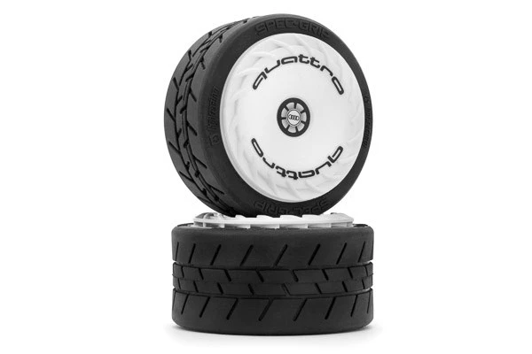 Not only is the e-tron one of our most ambitious and detailed bodies, our designers have captured every last detail, right down to the Quattro emblazoned racing wheels. Wrapped around these beauties is a set of treaded rubber tires for maximum grip on just about every paved surface. You"ll get great acceleration, braking and cornering performance from these semi-slick, grippy rubber tires!