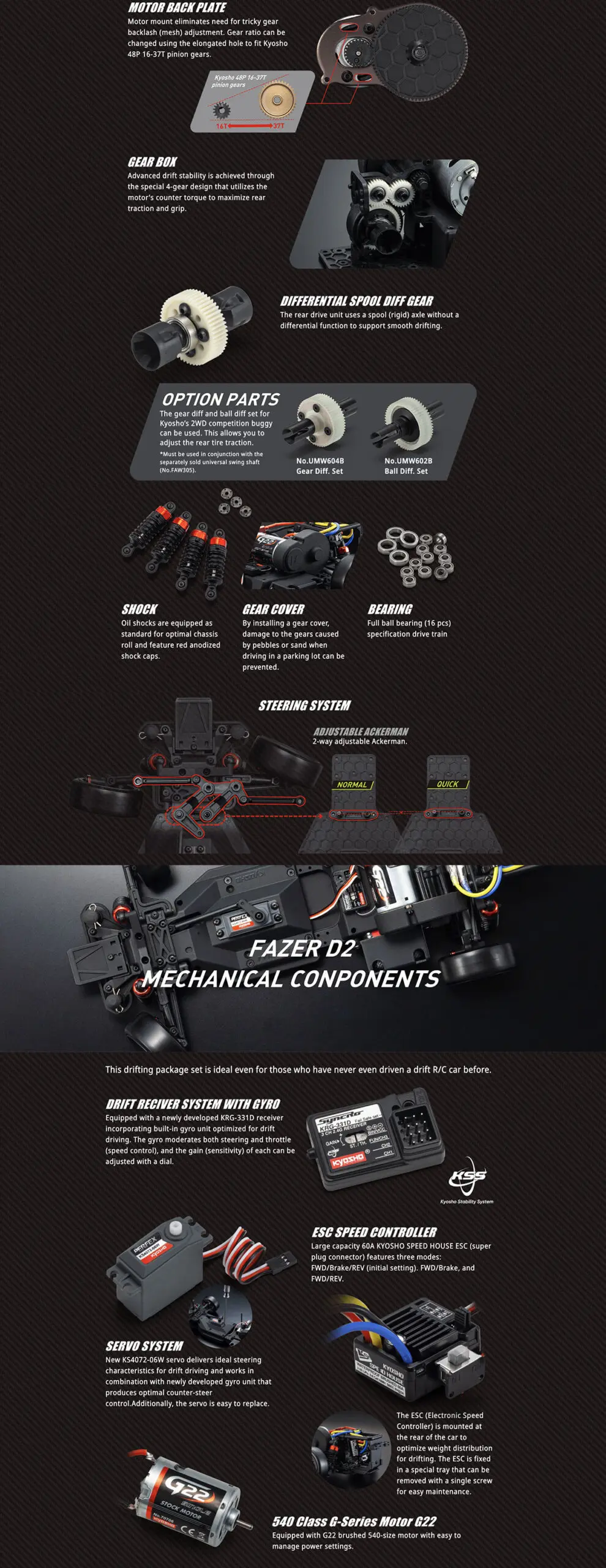 The Fazer D2 chassis offers adjustable wheelbase and tread width, allowing compatibility with various body styles and personal tuning preferences. Equipped with oil-filled shocks and a rigid rear axle, the chassis delivers consistent handling and stability during high-speed drifts. The high-mounted motor enhances rear traction, while the full ball bearing drivetrain ensures smooth power delivery.