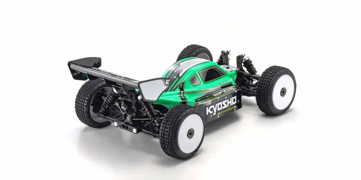 The worldwide status of the 1/8 scale buggy category has been built on a combination of high speed and dynamic fun. In recent years, EP (electric) buggies powered by batteries and electric motors have grown in popularity. Based on its celebrated 1/8 GP Inferno series buggy, Kyosho releases the electric powered Inferno MP10e Readyset! The new MP10e features significant updates but inherits the Inferno MP9e Evo. V2’s optimal weight balance from its left-right battery distribution that became adopted widely in 1/8 EP buggy designs. This layout also allows easier maintenance. Output characteristics of the KV2300 motor can be programmed on BRAINZ 8 ESC (electronic speed controller). With the R/C system pre-installed, you can be driving after unpacking the model and charging the battery. Equipped with the newly developed high torque and waterproof KS5071-09MW steering servo, the MP10e can handle the heavy loads of hard off-road driving. The cornerstone of the MP10e’s high performance and reliability is the suspension system, which is similar to the Inferno MP10 GP model. Not only can you outrun GP models with the Inferno MP10e; this high-powered electric machine is packaged as a Readyset with the racing potency to succeed at the highest level.