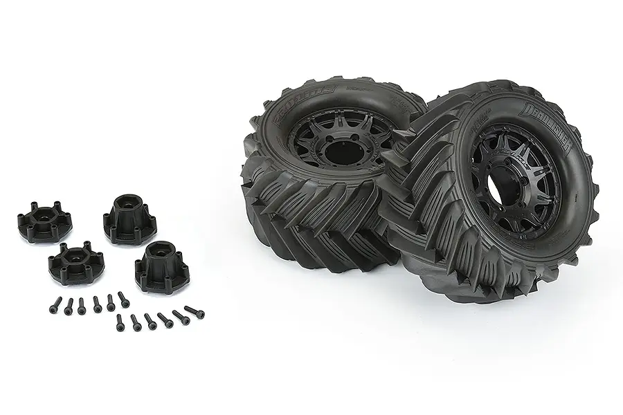 The Demolisher 2.8" tire comes pre-mounted on a true next-generation 2.8" wheel design from Pro-Line, the Raid 2.8" Removable Hex Wheel for all 2.8" tires! Imagine being able to easily change the offset of your wheel to fit different applications by simply changing out the hex! You can go from the included 12mm narrow offset (2wd Stampede®/Rustler® Rear) to the included 12mm wide offset hexes (2wd Stampede®/Rustler® Front and 4x4 Stampede®/Rustler® Front and Rear) quickly and easily. Also, imagine being able to replace a damaged wheel hex without needing to replace your glued tires (PRO633500 Replacement Hexes) or even upgrading your wheels to 14mm or 17mm wheel hexes (PRO634700 and PRO633600 Sold Separately) for extreme use! These new Raid 2.8" wheels accomplish all of this and more by using Pro-Line's unique 6x30 interlocking hex design that is secured to the wheel by 6 M3 screws that are spaced 30mm across. The built-in adjustability and ease of use make this a new must-have wheel for bashers everywhere!