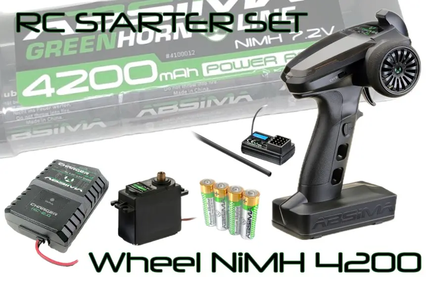 Genuine Absima part #2200014 — RC Starter Set "Wheel NiMH 4200". UK stock via Radio-Controlled.co.uk.