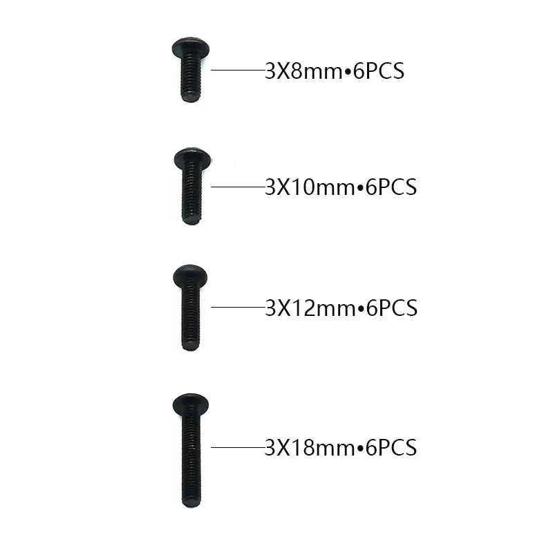 Replacement button head screw set for Rlaarlo on-road models. Sizes include M3*8mm, M3*10mm, M3*12mm and M3*18mm. Contains 6 of each screw. Part number R10100.