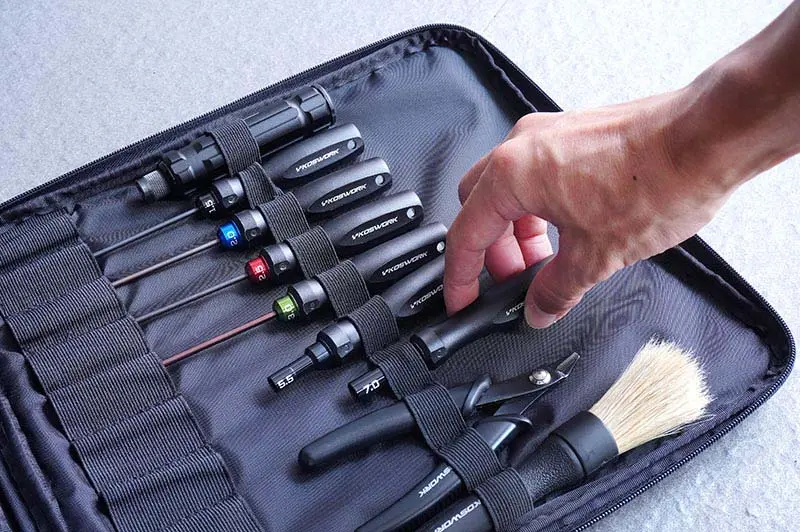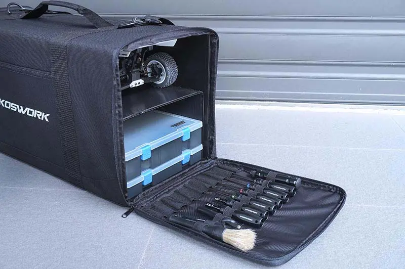 Built with a rigid nylon corrugated frame for durability, this Kosworks bag features inner elastic tool loops to secure your essentials, plus a dedicated net pocket for your transmitter and accessories. A front pocket keeps your mobile phone and smaller items easily accessible. Made in Taiwan to exacting standards, it's an essential piece of kit for any RC hobby enthusiast in the UK who demands quality RC car storage.