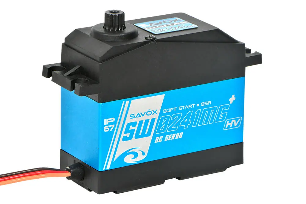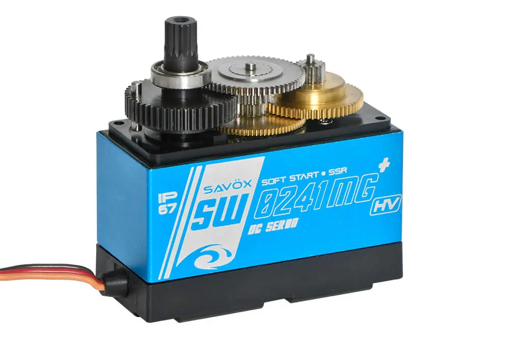 The Savox SW0241MG+ is our waterproof high torque 5th scale metal gear digital servo. This servo is high voltage capable and features of torque @ 7.4V
