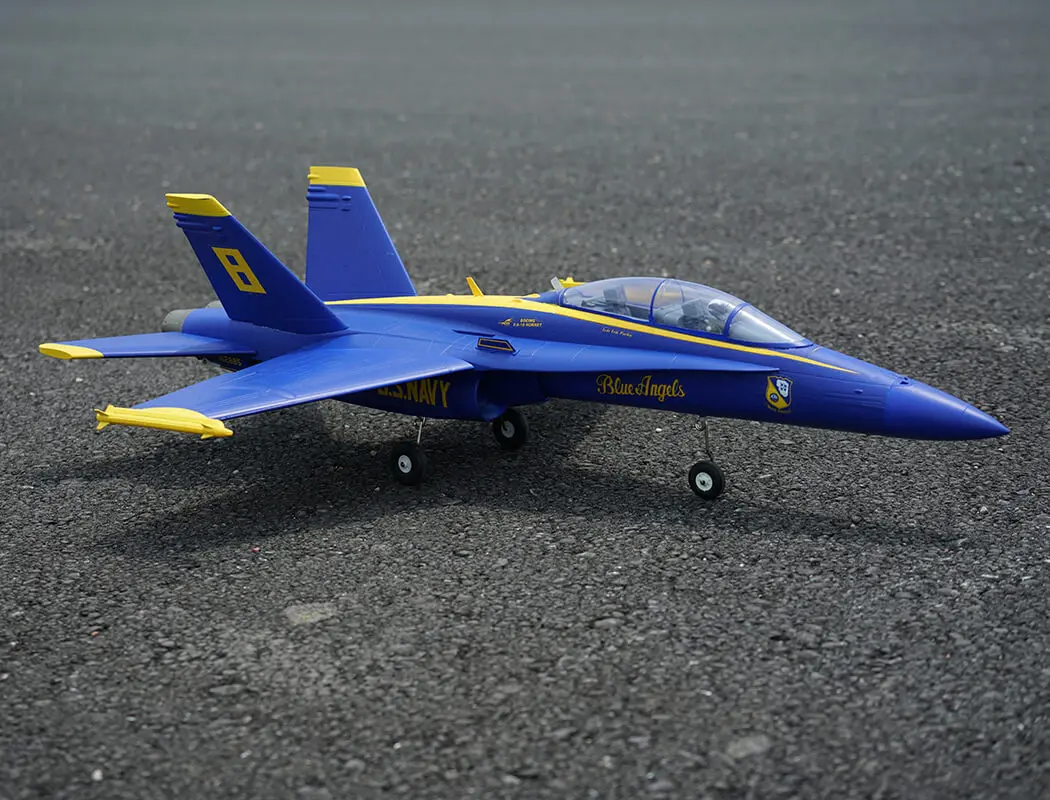 The factory-installed power system, including twin efficient 1413-KV5500 brushless motors and twin 20A brushless ESCs, paired with a 4S LiPo battery, delivers an abundance of thrust for fast climbs, rolls, loops and endless fun for high alpha flying due to the F-18’s low wing load and full flying stabs. A flight time of around 3-8 mins can be achieved with proper throttle management.