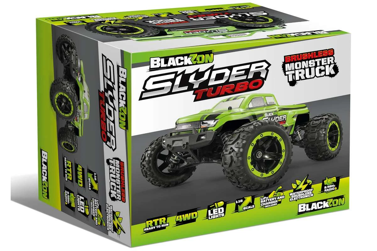 The BlackZon Slyder Turbo is perfect for getting into RC jumping, performing stunts, bashing - and even crashing! The Syder Turbo trucks are FAST but simple to use and extra-durable: they"re all about simple charge-and-go fun and just keep coming back for more!