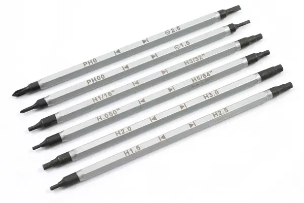 Phillips PH00 and PH0, 1.5mm and 2.5mm flat head screw driver bits.