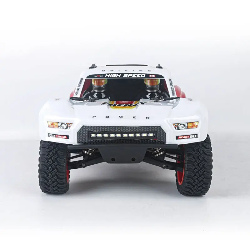Its 4WD drivetrain, wide off-road tyres, and long-travel suspension allow the truck to maintain grip and stability on uneven terrain, while the lightweight yet durable plastic chassis keeps weight balanced for predictable control at high speeds. The full-scale short course truck bodyshell, finished in red with bold racing graphics, adds both durability and aggressive styling.