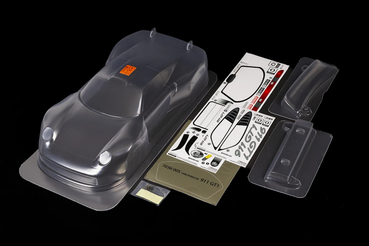 Like all HPI bodies, the Porsche 911 GT1 is molded from crystal-clear, impact-resistant polycarbonate plastic and comes with a clear protective overspray film, vinyl window masking and a large decal sheet. Made of flexible vinyl to fit every curve on the body, the decal sheet includes official Porsche decals, headlights, tail lights, and door handles, plus official Porsche and HPI Racing logos! The body also has drill locations marked for HPI sedan cars, making it easy to line up the body mount and antenna holes.