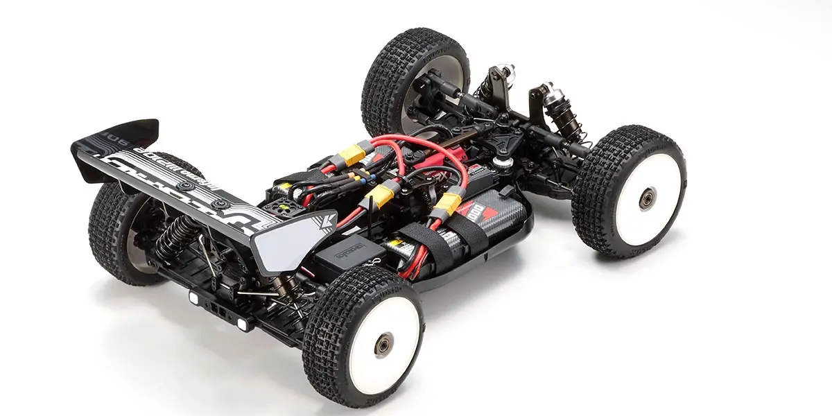 The worldwide status of the 1/8 scale buggy category has been built on a combination of high speed and dynamic fun. In recent years, EP (electric) buggies powered by batteries and electric motors have grown in popularity. Based on its celebrated 1/8 GP Inferno series buggy, Kyosho releases the electric powered Inferno MP10e Readyset! The new MP10e features significant updates but inherits the Inferno MP9e Evo. V2’s optimal weight balance from its left-right battery distribution that became adopted widely in 1/8 EP buggy designs. This layout also allows easier maintenance. Output characteristics of the KV2300 motor can be programmed on BRAINZ 8 ESC (electronic speed controller). With the R/C system pre-installed, you can be driving after unpacking the model and charging the battery. Equipped with the newly developed high torque and waterproof KS5071-09MW steering servo, the MP10e can handle the heavy loads of hard off-road driving. The cornerstone of the MP10e’s high performance and reliability is the suspension system, which is similar to the Inferno MP10 GP model. Not only can you outrun GP models with the Inferno MP10e; this high-powered electric machine is packaged as a Readyset with the racing potency to succeed at the highest level.