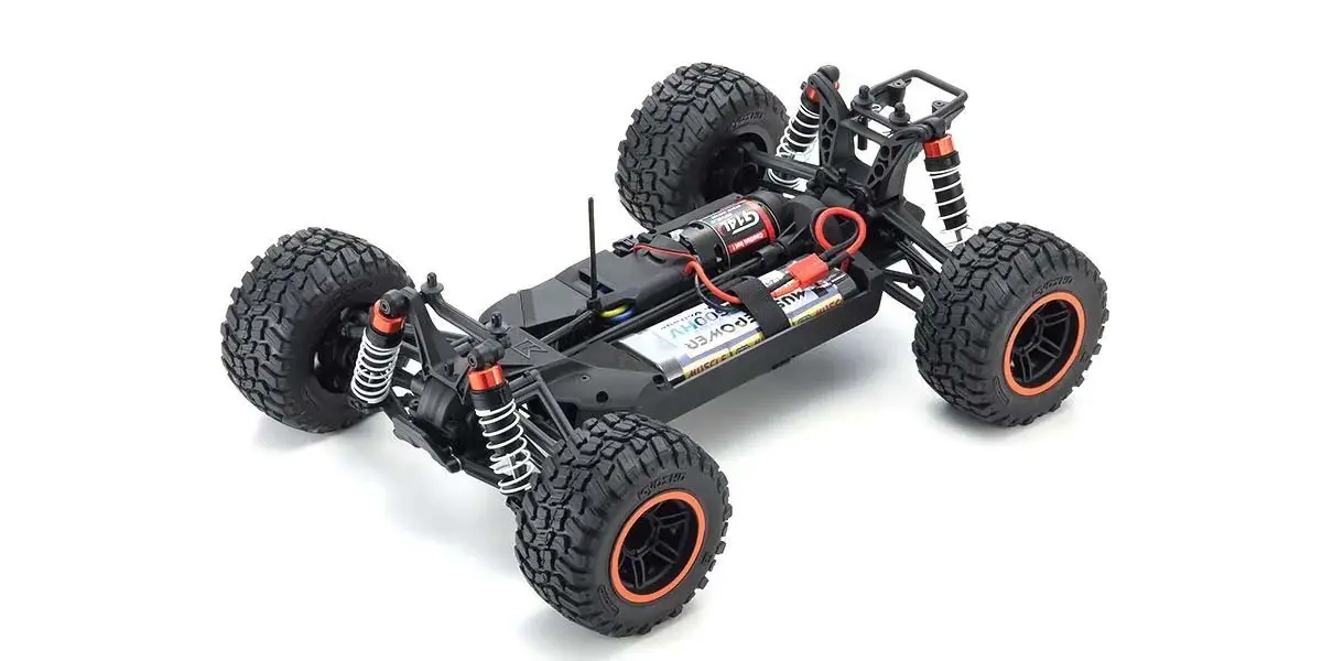 This ready to run RC car arrives fully assembled and electronics-ready, eliminating the need for complex setup procedures. Powering this 1/10 radio controlled truck is a Kyosho 550 Class G14L brushed motor paired with a capable 60A electronic speed controller compatible with both NiMh and 2S LiPo batteries. The fixed gear mesh motor mount accepts pinion settings from 21T to 29T, offering impressive tuning flexibility without requiring adjustment tools. The shaft-driven 4WD system utilises 2-bevel grease-filled differentials front and rear, combined with full ball bearings throughout to minimise friction and drive loss. This electric RC car UK enthusiasts can trust includes the Syncro KT-231P+ 2.4GHz transmitter with adjustable throttle trim, steering trim, throttle EPA, and dual rate controls. The striking American Rock Racer-inspired bodywork arrives pre-painted with decals applied, ready for immediate use. As a quality Kyosho radio controlled model, it represents exceptional value within the competitive RC hobby UK market.