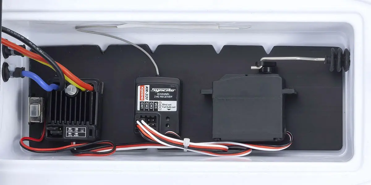 Optimal angle of the stern tube along the bottom of the hull reduces drive resistance, allowing the fully submerged propeller to generate sharp acceleration and maneuverability.Hull incorporates built-in waterproof radio box, further supported by waterproof speed controller and rudder servo for even greater protection.