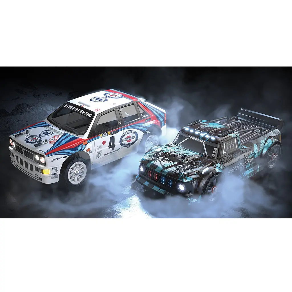 Powered by a 2852 brushless motor and 45A waterproof ESC, the Hyper Go 14301 achieves speeds of up to 67km/h with a 3S 11.1v LiPo battery or around 45km/h with a 2S 7.4v battery. Its 4WD system with metal differentials and driveshafts ensures precise handling and excellent traction, while oil-filled aluminium shocks and fully adjustable suspension make it a true drift-ready RC car.