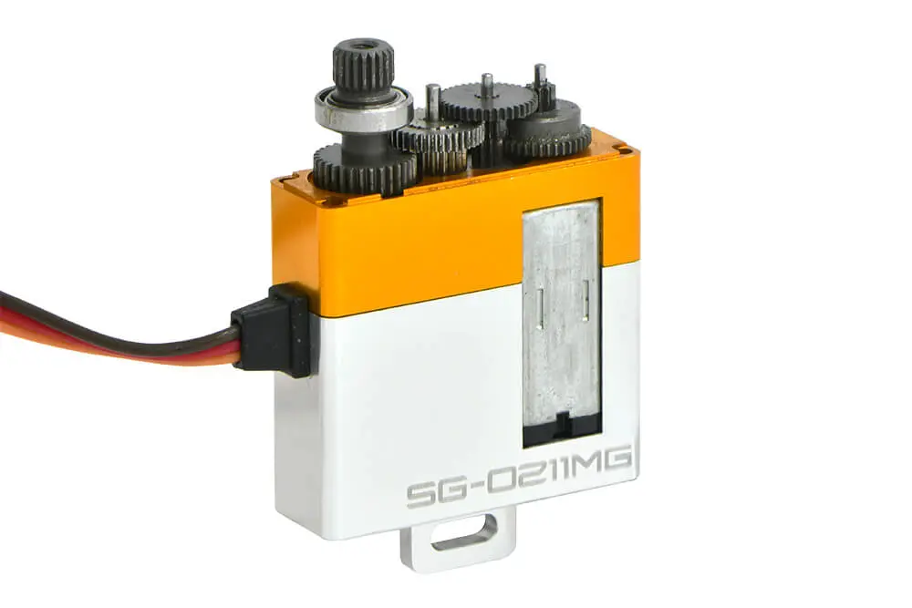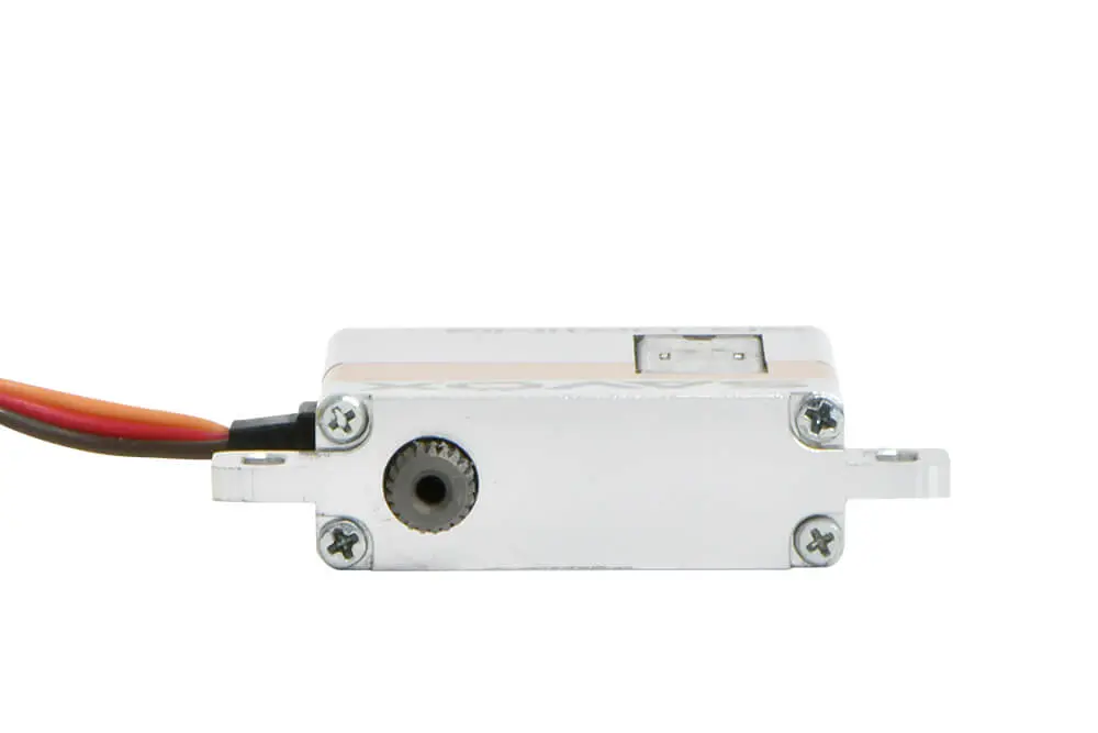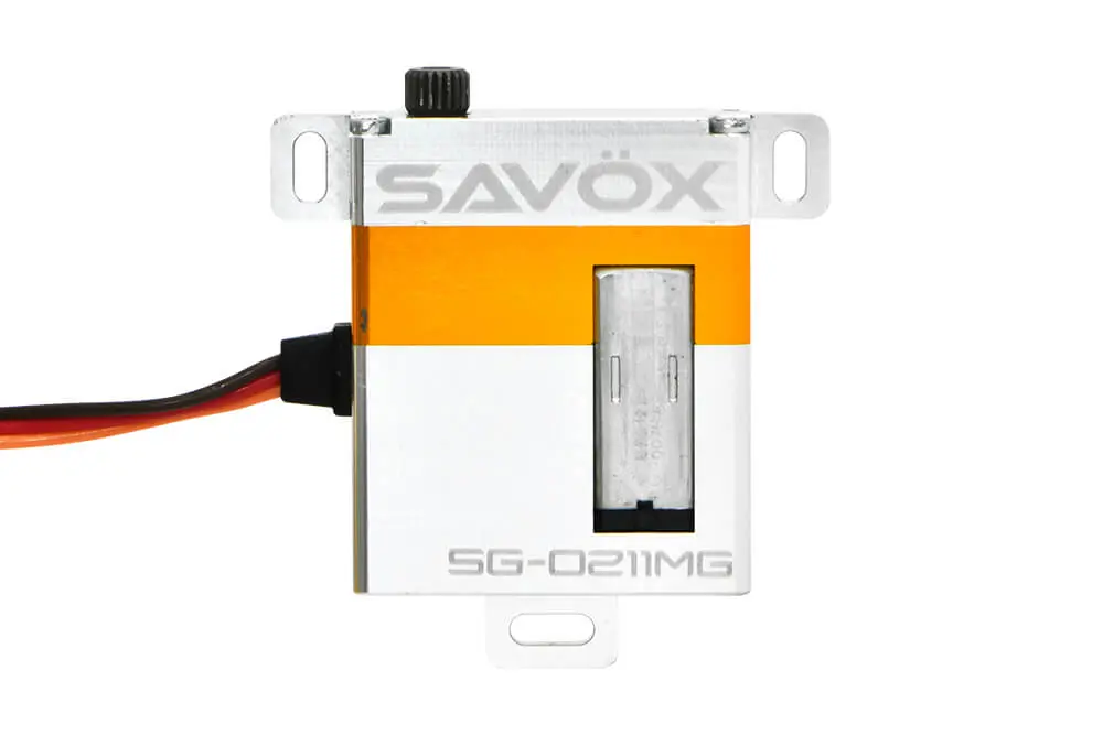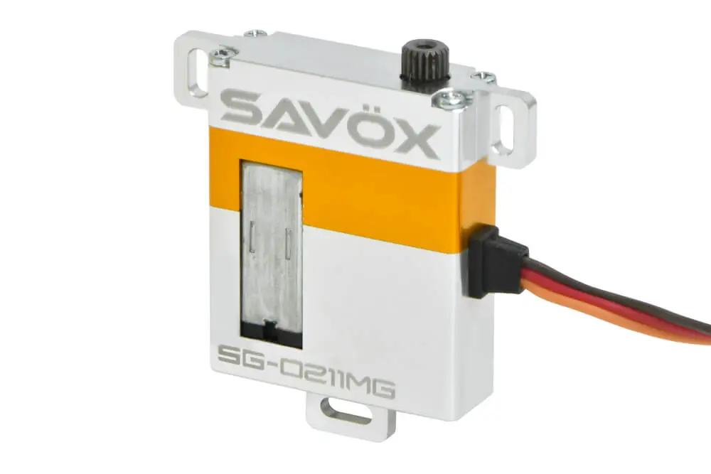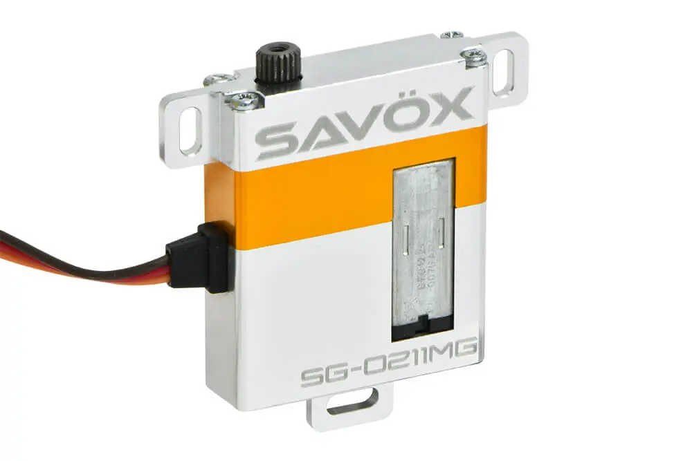 The Savox SG0211MG servo is only 10mm deep and therefore ideal for the usage in thin wings of speed models and gliders. The full aluminium case makes it light and prevents over-heating. Highest precision for your model is guaranteed by backlash double ball bearing gears. Delivery includes a special servo arm for the use in wings and a solid frame for easy mounting.