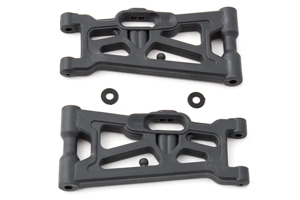 Upgrade your Team Associated B64D buggy with these durable hard compound front arms. Engineered for enhanced performance and longevity, these Team Associated parts deliver the reliability you need for competitive racing and recreational driving. Whether you're an experienced racer or exploring the radio controlled car hobby in the UK, genuine Associated Electrics spare parts ensure your machine performs at its best. This package includes two front arms and spacers for straightforward installation.